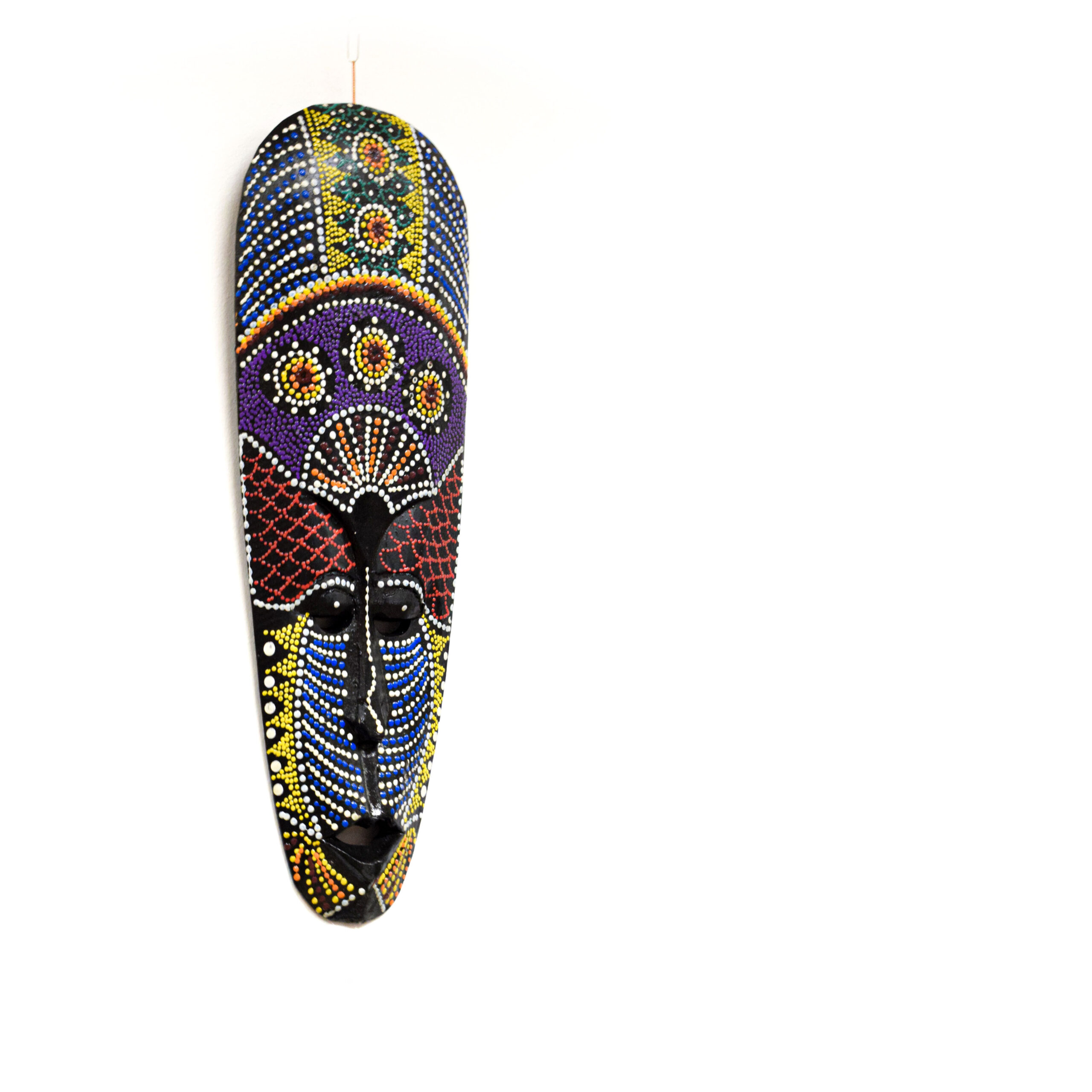 Dobd fel otthonod hangulatát ezzel az egyedülálló, kézzel festett afrikai törzsi maszkkal! A részletgazdag, pontozott festés és az élénk, mégis harmonikus színek a hagyományos afrikai törzsi motívumokat idézik, modern, dekoratív formában.