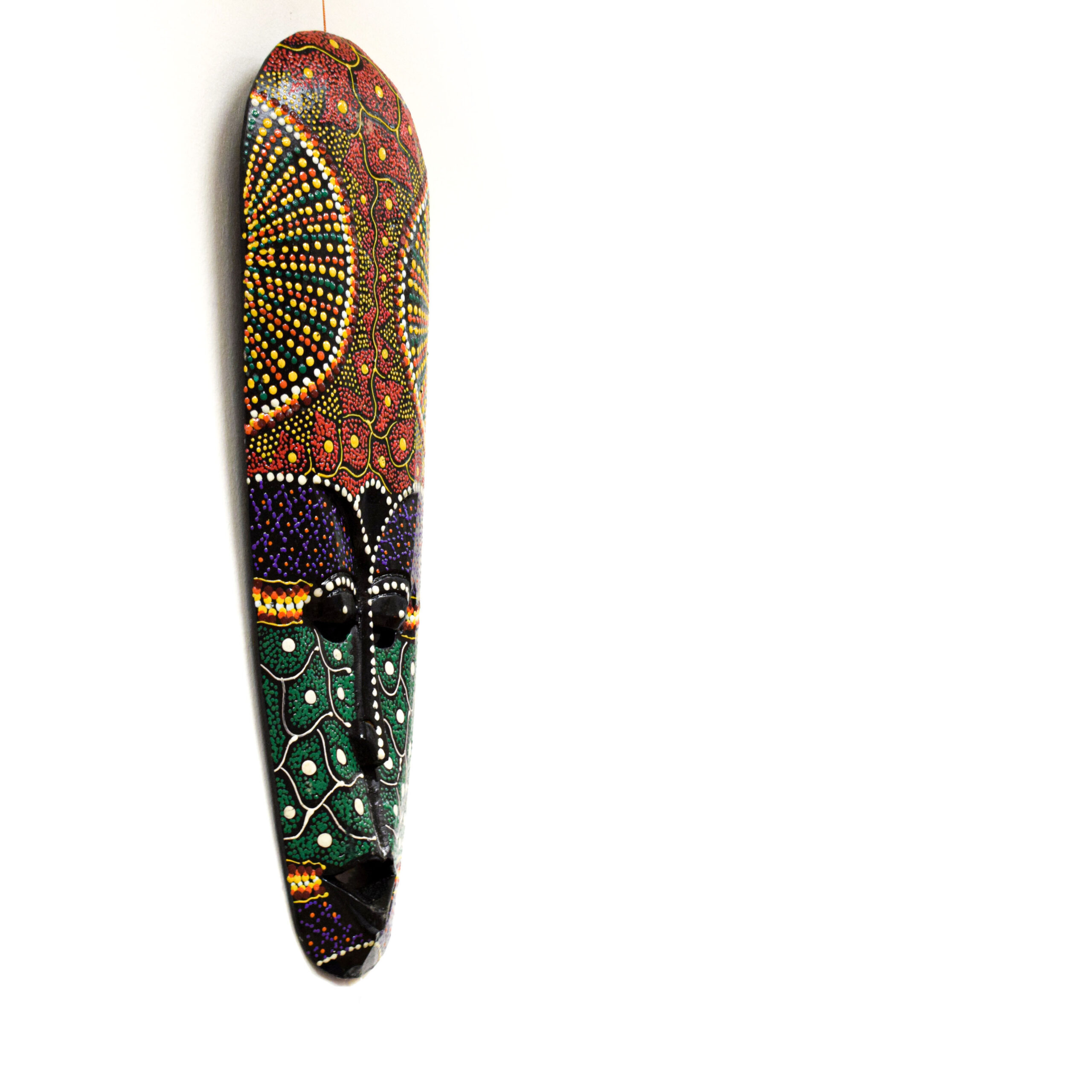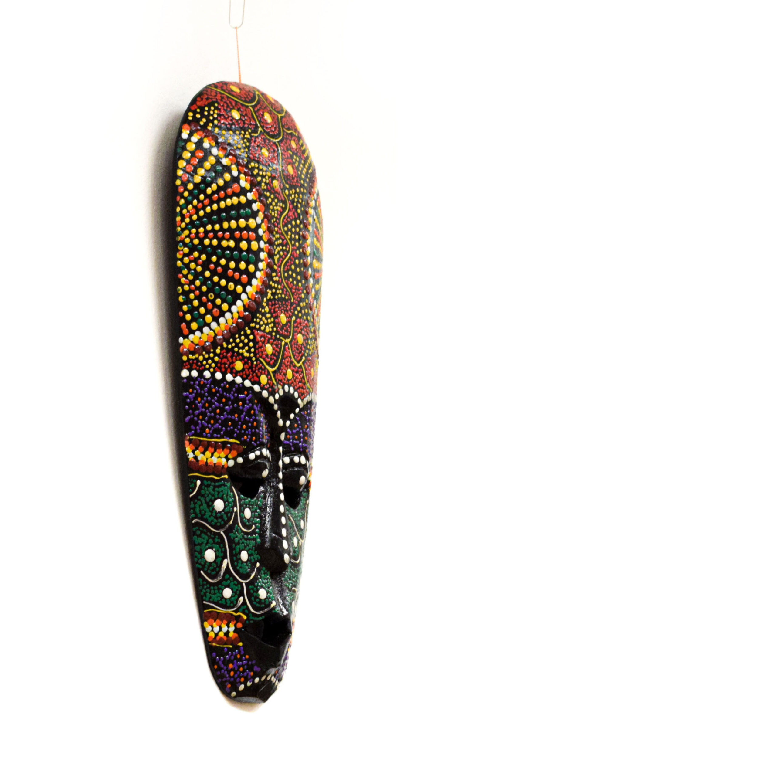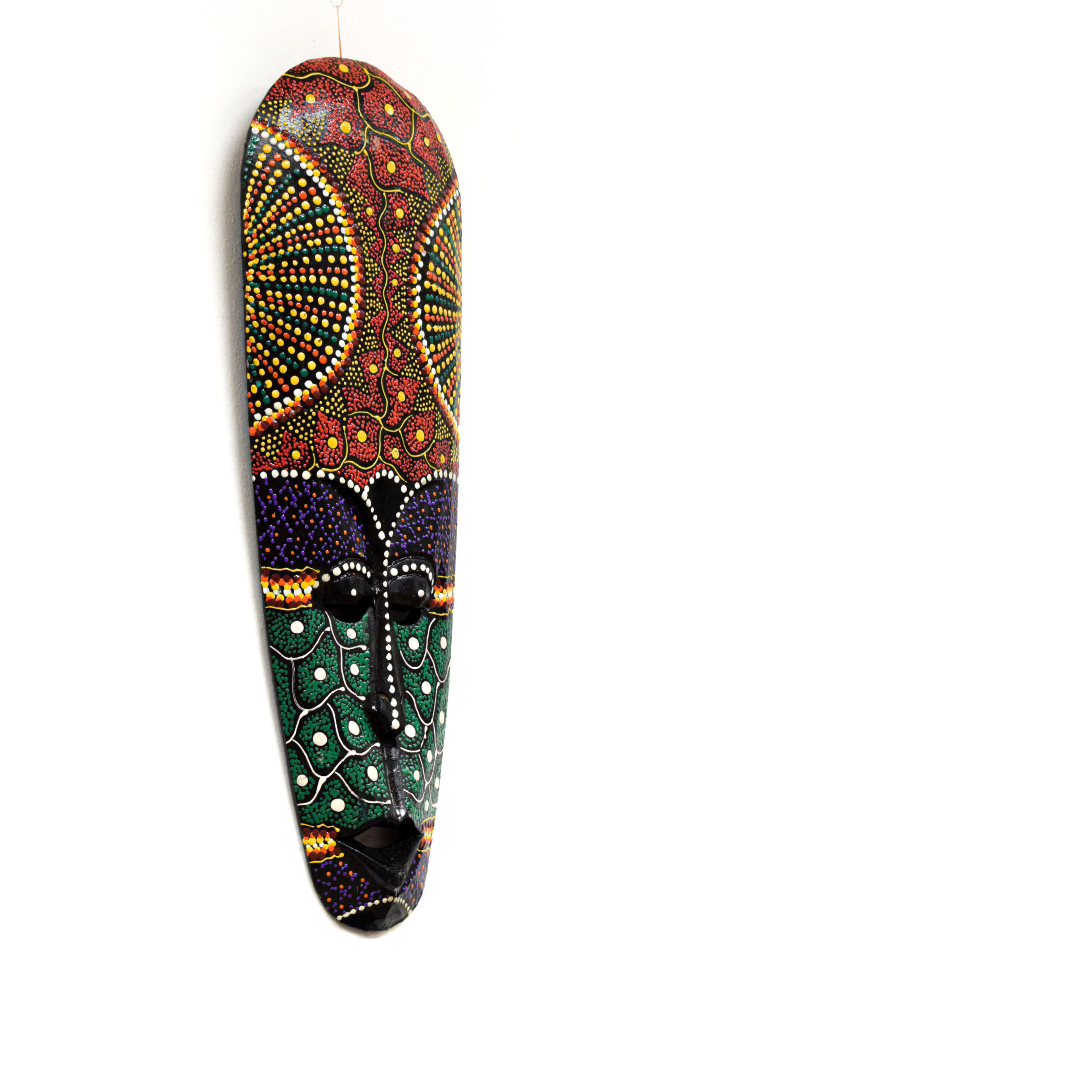 Dobd fel otthonod hangulatát ezzel az egyedülálló, kézzel festett afrikai törzsi maszkkal! A részletgazdag, pontozott festés és az élénk, mégis harmonikus színek a hagyományos afrikai törzsi motívumokat idézik, modern, dekoratív formában.